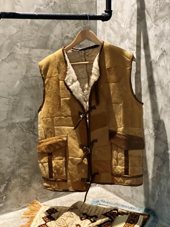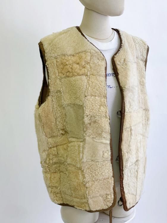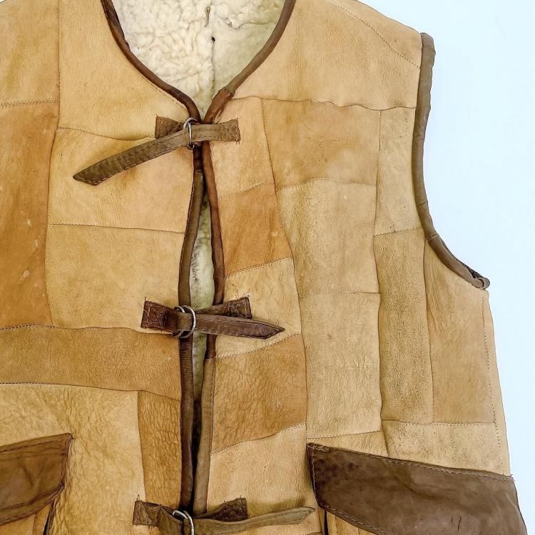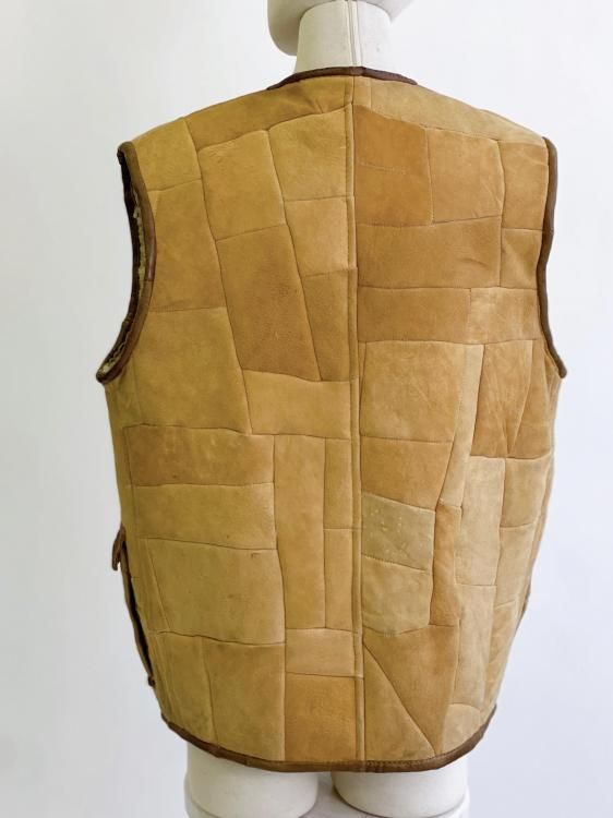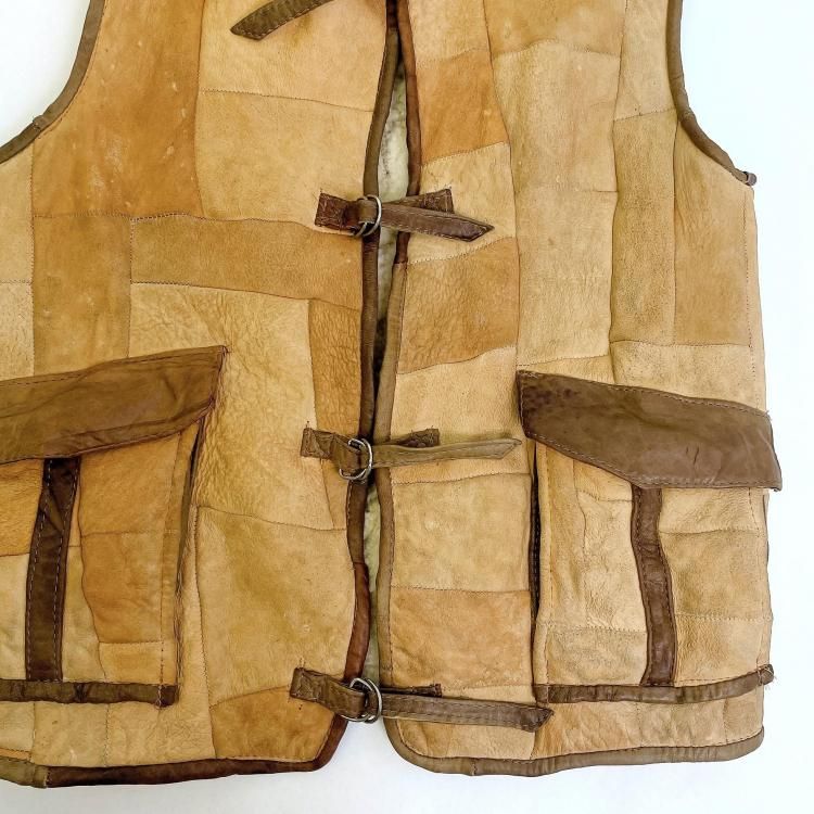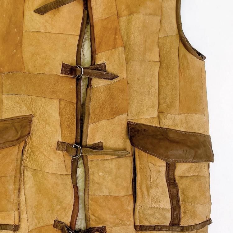 ムートンレザーをパッチワーク状に使用したレザーベスト。